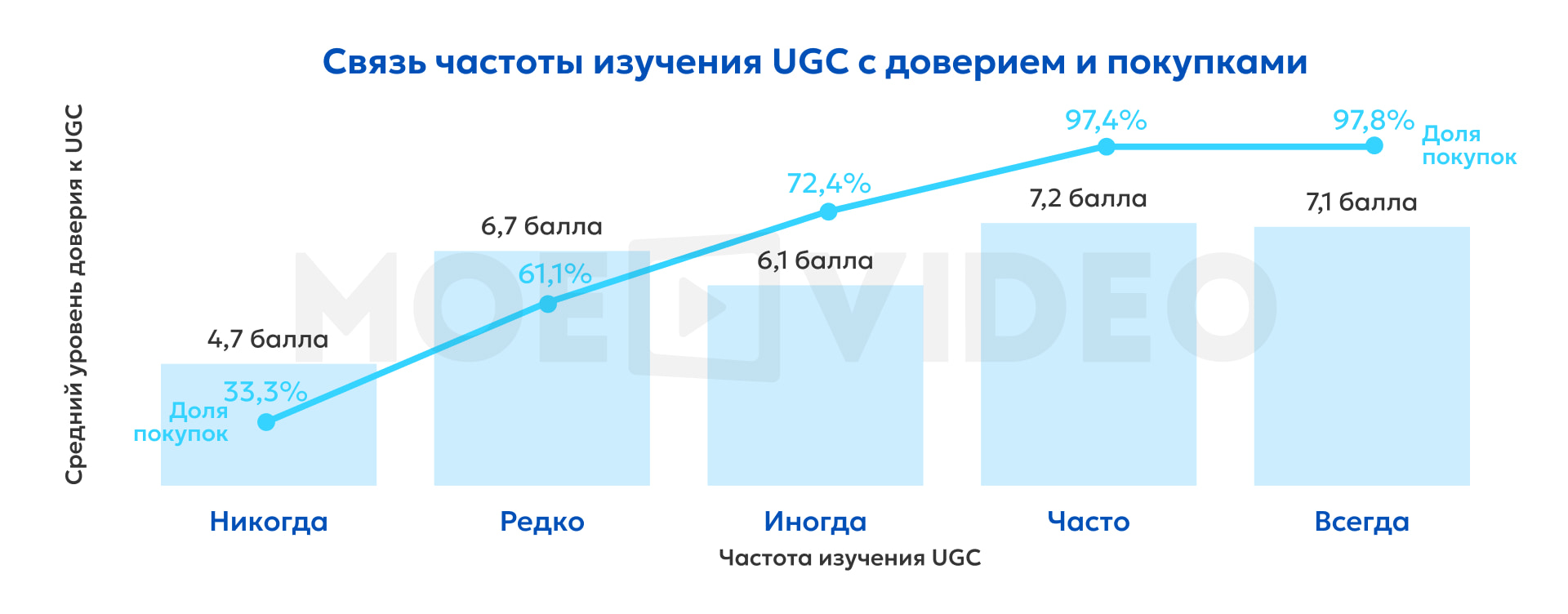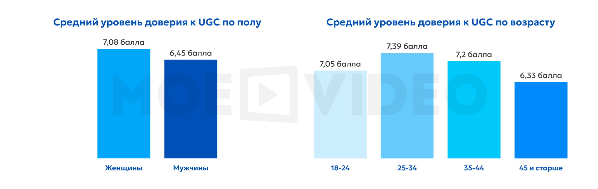 Пользовательский контент чаще находит отклик у женщин: их средняя оценка доверия к UGC составляет 7,1 балла против 6,4 у мужчин. Это, вероятно, связано с тем, что женщины активнее изучают отзывы и опыт других, тогда как мужчины чаще обращаются к альтернативным источникам и проявляют большую осторожность.