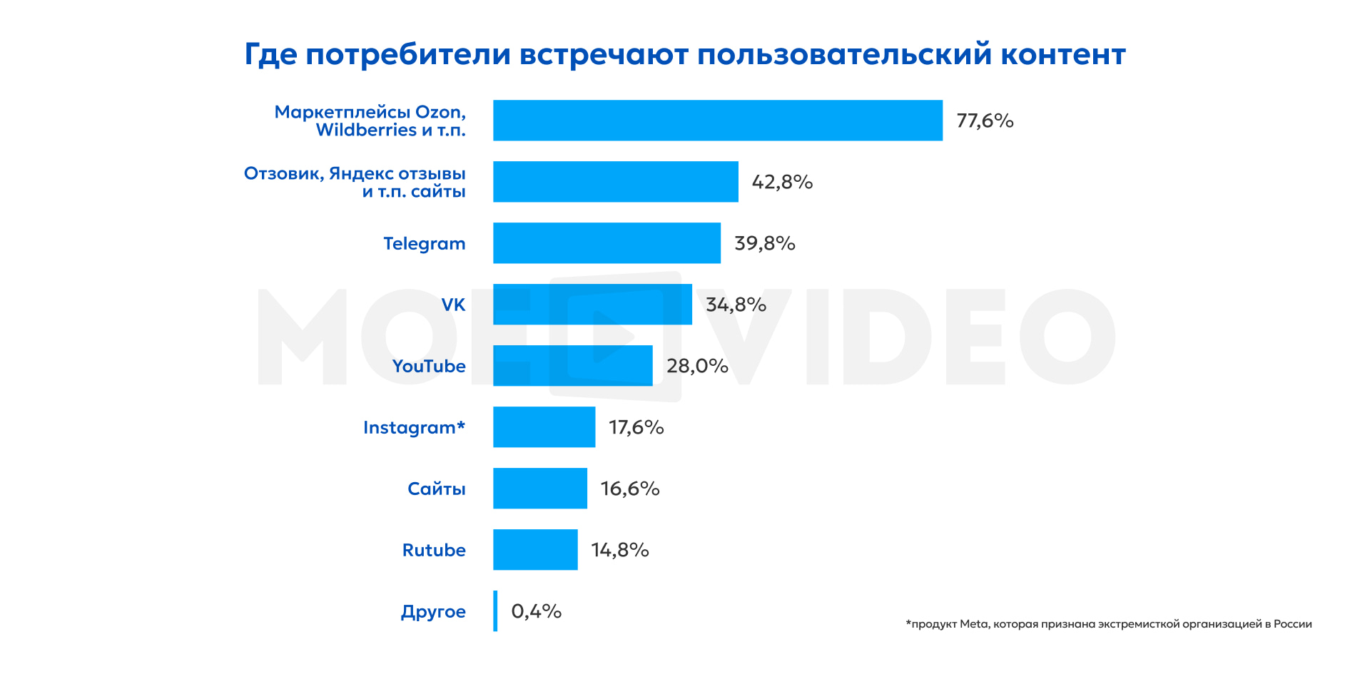 Пользовательский контент наиболее заметен там, где принимаются решения о покупке: онлайн-маркетплейсы являются главным каналом его распространения. Почти 78% респондентов чаще всего сталкиваются с UGC на торговых площадках (Ozon, Wildberries), в первую очередь в виде отзывов под карточками товаров. На втором месте — специализированные отзовики (42,8%).